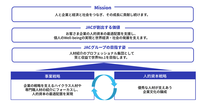 JACグループの強みは、企業顧客の課題解決に資する最適な人材を紹介できるプロフェッショナルなコンサルタントであり、その優秀なコンサルタントが相互に支えあい、チームワークで成果を達成する企業文化にあります。「質と収益で世界No.1 」という事業戦略目標の達成に向け、この優秀な人材層を拡大しつつ、支えあう企業文化を深く浸透させていくことがJACグループの人的資本戦略の基軸となります。そして、全ての優秀な人材が、それぞれの個性を発揮して活躍することができるように、魅力的な職場環境や人事制度・報酬制度などの整備に取り組んでいます。