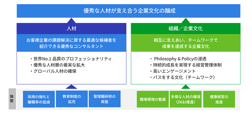 この事業戦略を実現するためには、ハイクラス人材・プロフェッショナル人材に相対することができる優秀な人材を確保・育成し、その優秀な人材がともに支えあう企業文化を醸成する人的資本戦略をあわせて推進することが不可欠です。