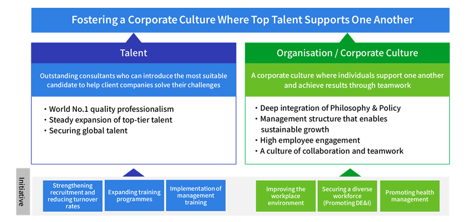 To realise this business strategy, it is essential to secure and develop top-tier talent capable of engaging with high-calibre professionals. At the same time, fostering a corporate culture where these exceptional individuals support one another is a fundamental aspect of our human capital strategy.